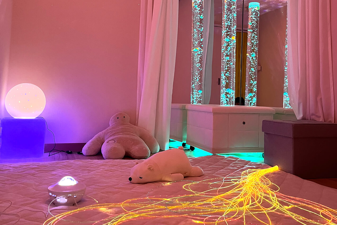 スヌーズレンルームには、光・音・匂い・振動・触覚の素材等、感覚を優しく刺激するものが効果的に配置してあります。